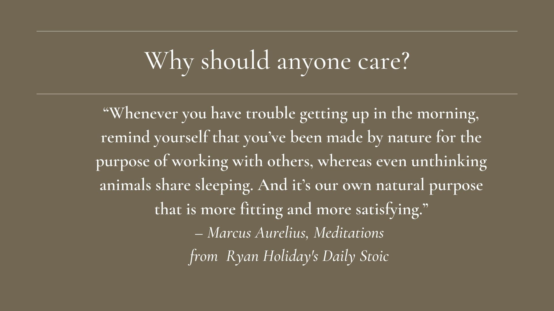 “If you need an extra boost to get out of bed tomorrow morning, something more than caffeine can offer, use this : PEOPLE ARE DEPENDING ON YOU.” – Daily Stoic